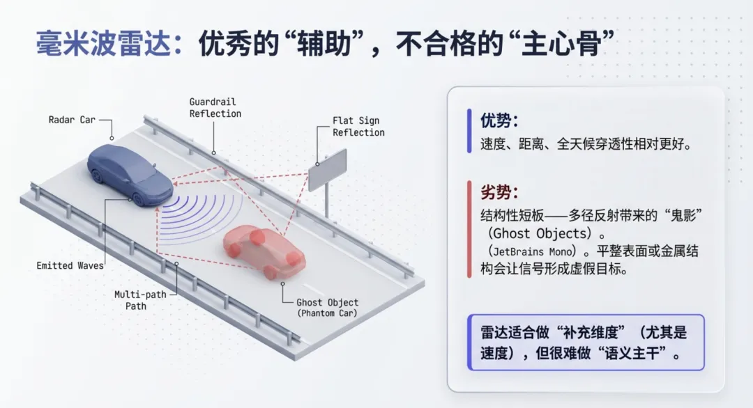 至于毫米波雷达,虽然它在测速和穿透力上有优势,但其结构性的短板同样不可忽视。比如在面对平整表面或金属结构时,多径反射产生的“鬼影”(ghost objects)依然是行业公认的顽疾。, 这决定了它只能作为补充维度,而无法成为支撑驾驶逻辑的“语义主干”。