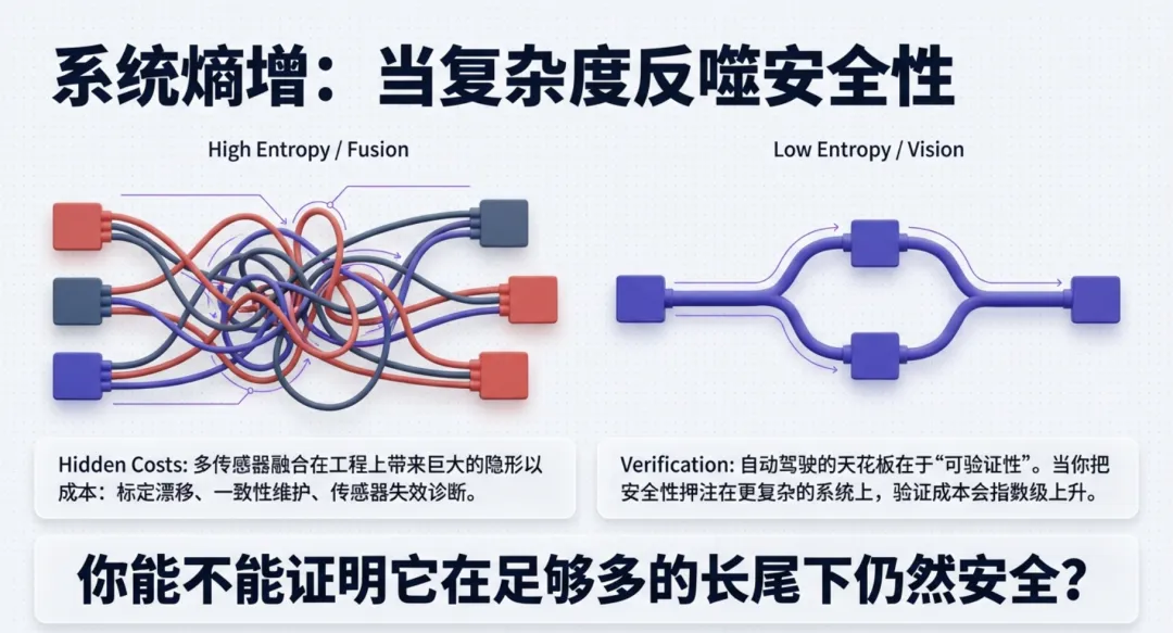 标定漂移、传感器失效诊断、不同信源冲突时的决策优先级……每一个维度的增加都在考验系统的验证能力。 自动驾驶的天花板之一,就在于你能不能证明它在无数长尾场景下依然安全。 当你把安全性押注在一个无法简单证明其安全性的复杂系统上时,验证成本的暴涨最终会反噬掉技术本身的增益。
