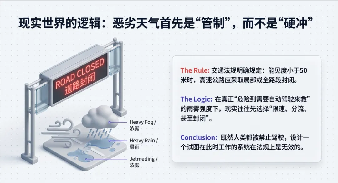 我们必须正视一个常识:在我国,当能见度小于 50 米时,交管部门通常会采取局部或全段封闭高速公路的管控措施。 交通管理的底层逻辑永远是“先减少暴露,再谈通过”。