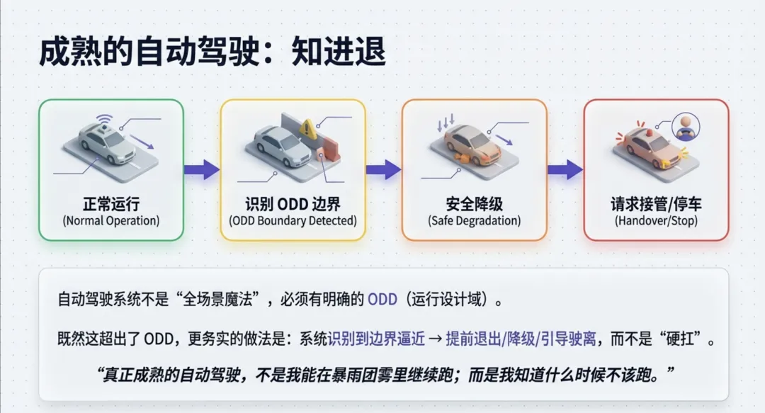 一个真正成熟、诚实的工程方案,不应该标榜自己在暴雨团雾里能跑多快,而应该在识别到环境逼近 ODD 边界时,主动、安全地选择降级、引导驶离或者请求接管。