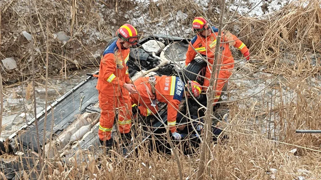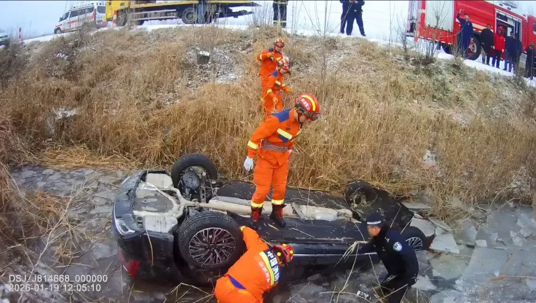 车辆打滑侧翻进结冰的水沟