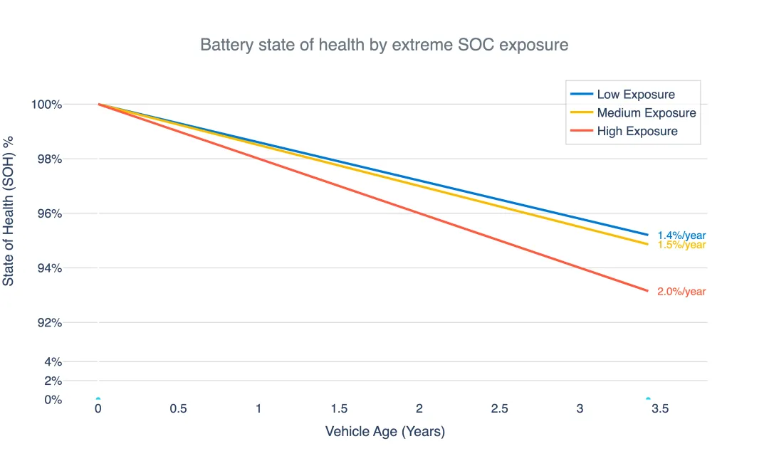 (图注:数据显示,只有当车辆极度频繁地(超过80%的时间)处于高电量或低电量状态时,衰减才会明显加速。中低频率的满充满放影响不大。)