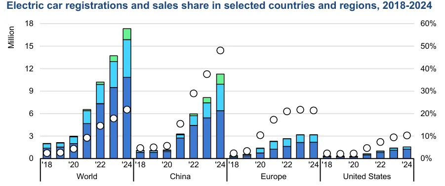 根据国际能源署发布的《全球电动汽车展望2025》,2024年全球电动汽车销量达1700万辆,同比增长25%,首次占全球汽车市场份额20%。