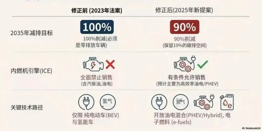 欧盟放宽了原定于2035年生效的燃油车禁令,将新车“零排放”目标调整为“减排90%”。这意味着,2035年后,插电式混合动力、增程式电动车,甚至燃油车在满足特定条件下仍可继续销售。