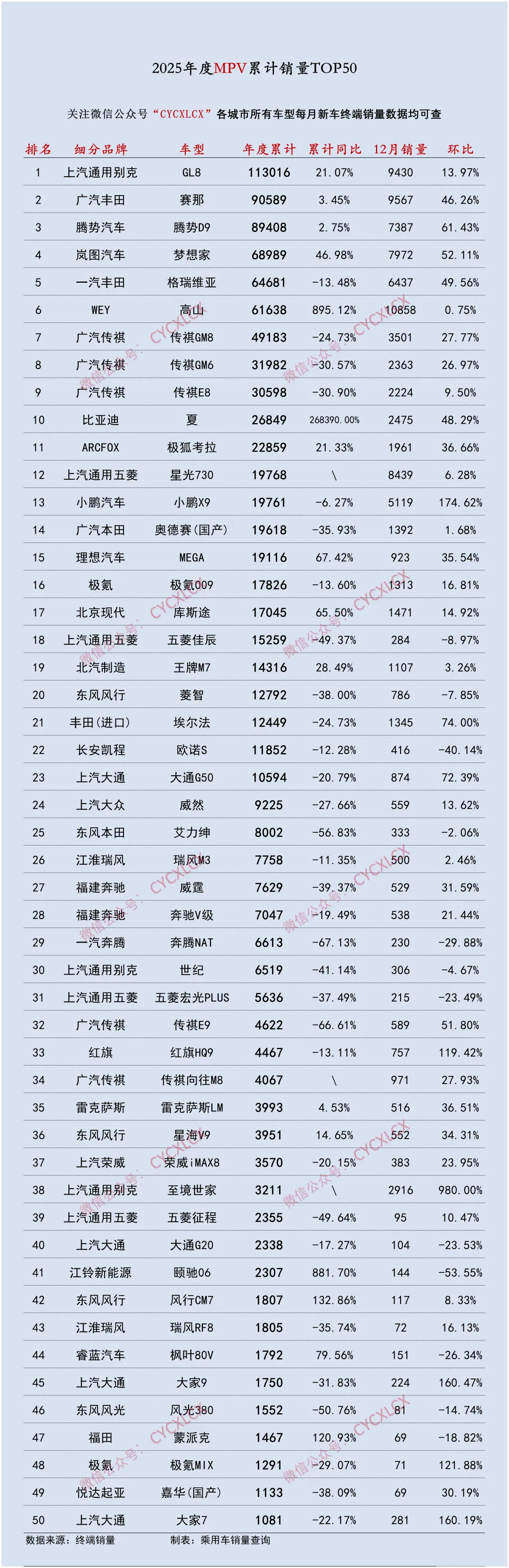 别克GL8以11.30万辆登顶,同比增21.07%,12月销量0.94万辆、环比涨13.97%。广汽丰田赛那(9.06万辆)、腾势D9(8.94万辆)紧随其后,三者差距仅2.36万辆,头部竞争白热化。