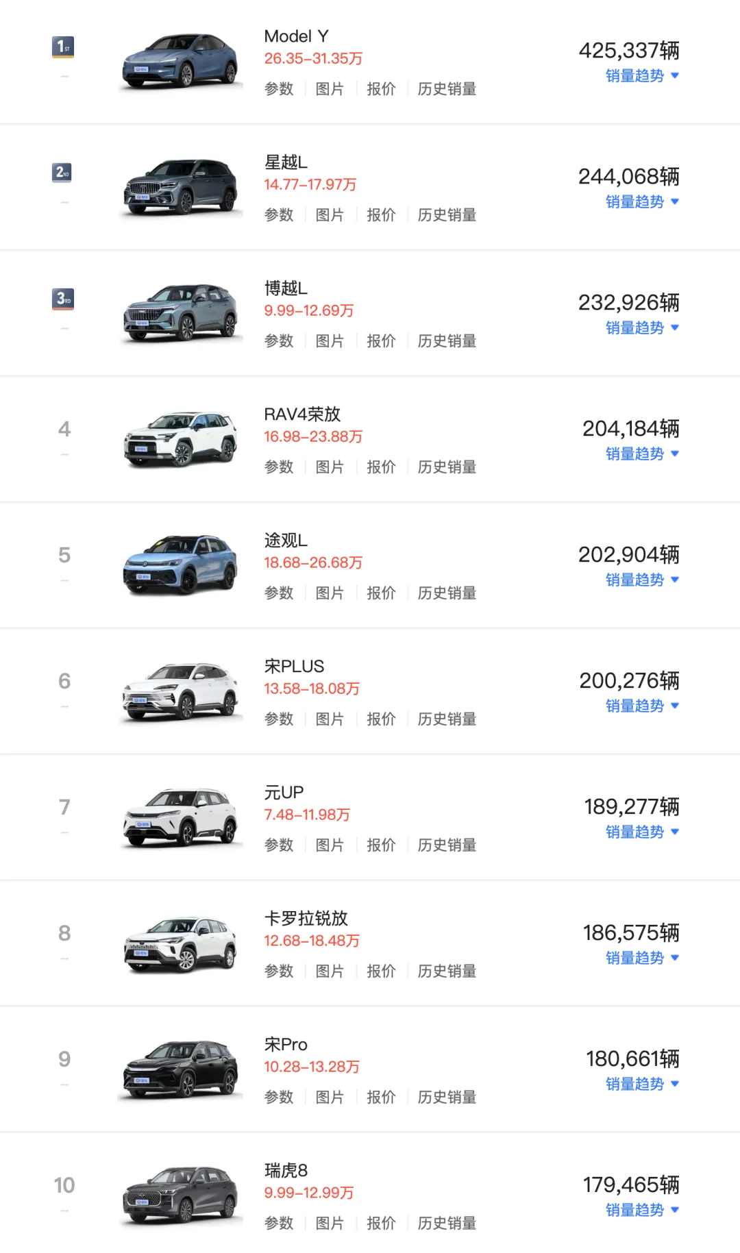 再来看看SUV榜单,Model Y以425,337辆的成绩拿下2025年国内SUV市场第一的位置,同时也是SUV前十榜单中起售价最高的车型,其2025年12月销量65874辆。特斯拉在2025年推出焕新Model Y以及Model Y L叠加免息政策,成为Model Y爆款的主要原因。不过,2025年Model Y的销量同比出现下滑,国产新能源对于特斯拉的威胁还是在的。
