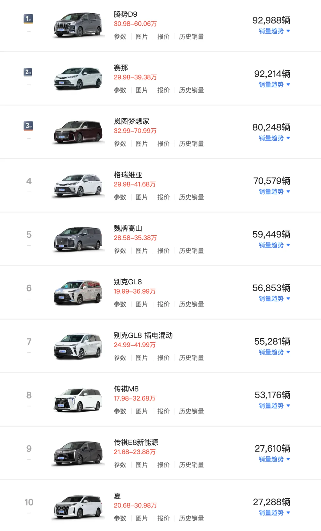 从榜单来看,MPV销量Top10中新能源MPV占据6席,相对燃油动力,插混车型凭借“可油可电”的优势和MPV的天然契合度成为市场主流。品牌方面,腾势、岚图、魏牌等自主高端品牌在25万+市场站稳MPV市场,并持续以技术、配置、价格三重优势进一步抢占合资MPV的份额。但丰田赛那、别克GL8等在MPV市场深耕多年,仍然有相当强的认知和竞争力。