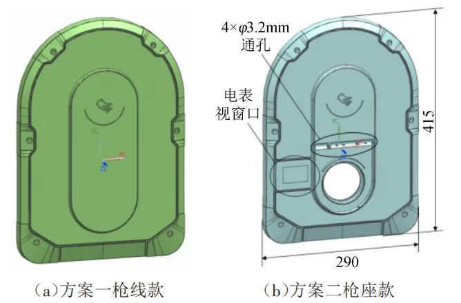 为响应市场多样化需求,提出了2种差异化充电桩外壳设计方案,如图1所示。其中,方案一(枪线款)采用底部出线结构,方案二(枪座款)在正面翻盖下方集成枪座接口。2款充电桩除面盖外,后壳等部件均为通用件,以降低研发及生产成本。面盖结构特征如图2所示,枪线款面盖采用平面化简约设计,可选配电表视窗模块;枪座款面盖集成枪座接口、翻盖转轴及电表视窗等特征。2款面盖外形尺寸统一为290 mm×415 mm×33 mm,平均壁厚3.5 mm。外观面需满足高光表面标准,并实施MT-11000级纹理处理。塑件选用PC-ASA复合材料,其性能优势继承了PC的高冲击韧性,同时兼具ASA的抗UV稳定性,使面盖在低温下仍能保持韧性,高温下也不易变形,在户外环境下长期使用不易变黄、开裂,且由于其良好的流动性能,能保障薄壁件的成型性。另外,枪座款面盖正面的4×φ3.2 mm通孔轴向与开模方向垂直,需采用斜推杆内侧抽芯机构实现脱模。