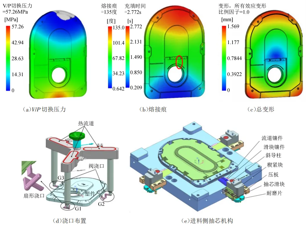 作为关键外件,面盖的成型质量要求较高,需控制整体变形量,且外观面严禁出现明显熔接痕、流痕及浇口纹等缺陷。经模流分析表明,单浇口方案因流道长度过长,导致注射压力峰值较大(达102.6 MPa);熔体流动前沿温度相差较大(约40 ℃),导致翘曲变形较大。经优化分析,采用 3 点式热流道系统后,注射压力降至 57.3 MPa,整体变形量降至 1.6 mm,且熔接痕被控制在可接受区域,如图 3(a)~(c)所示。综合考虑制造成本、镶件布置、注塑机压力等因素,最终采用热流道转普通流道复合系统,通过阀针时序控制实现顺序填充。采用热流道能保证熔体在注射过程中保持良好的热稳定性,确保熔体始终处于熔融状态,一方面可保证成型塑件质量稳定;另一方面可降低注射压力,有效改善熔体填充均匀性,减少飞边的产生。浇注系统浇口布置如图3(d)所示,其中G1浇口经侧抽芯滑块转接至待成型塑件底面;G2、G3浇口通过侧抽芯滑块双侧分布,侧抽芯机构如图3(e)所示,主要由斜导柱、抽芯滑块、楔紧块等部件构成。采用侧抽芯滑块进料方式能减少模具零件加工难度,优化布局,使模具结构更紧凑,拆装方便,便于后期维护及保养。采用扇形浇口设计,前端尺寸为15 mm×1.7 mm,为避免多浇口易产生长熔接痕问题及减少成型型件的变形量,控制阀针G1先开启,G2、G3采用顺序阀控制延时打开,实现型腔的顺序充填,提高成型塑件外表面质量。