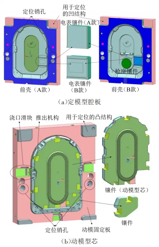 基于塑件结构特征,将定模型腔板配置A/B两款,如图4(a)所示,型腔板采用整体钢结构,强化整体结构刚度;另外设置可置换电表镶件实现功能拓展。动模部分采用镶件结构,如图4(b)所示,主要由动模固定板、动模型芯和镶件组成,其优势在于可降低NC加工难度,便于后期维护。