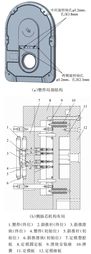 针对方案二(枪座款)面盖正面垂直于开模方向的4×φ3.2 mm旋转轴孔,如图5(a)所示,在定模侧设计4组同步侧抽芯机构,布局如图5(b)所示。