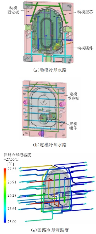 模具冷却系统对塑件成型质量(尤其是翘曲变形控制)具有决定性影响,需确保三维热场均匀分布。针对平板类塑件特征,采用基于直流通道的网格化立体水路架构。动模系统集成5组独立回路,如图6(a)所示,动模固定板上、下端各布设φ12 mm主冷却环,实现基体温控;动模型芯内部采用“左-中-右”三通道平行布局(间距(56±1)mm),有效抑制因冷却差异导致的变形;动模镶件则配置L形水路(180°转向)实现轮廓冷却。定模系统设计4组冷却水路,如图6(b)所示,定模型腔板布置正交排布的双循环水路(水平/垂直流向);定模镶件分别设置自适应水路实现局部热管理。仿真结果表明,系统进出水温差稳定在±3 ℃内,验证了该冷却方案的有效性,如图6(c)所示。