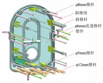 推出机构的核心功能是实现塑件与型腔的安全分离,其设计影响塑件合格率与生产效率。模具中塑件因PC-ASA材料收缩率(0.6%-0.8%)产生强包紧力,需合理规划推出系统。针对290 mm×415 mm平板结构特征,推出力分布不均会引发塑件翘曲变形及推出部位泛白缺陷,因此,在模具中设计三级分区推出系统:①基础推出单元:在盖面周围深槽区布置φ5 mm推杆阵列,螺钉孔双侧配置φ8mm加强推杆,底部区域采用8×φ12 mm主推杆形成基础脱模框架;②抗变形增强单元:9组推杆-推块单元覆盖塑件投影面,通过倍增接触面积实现全域应力均衡;③流道分离单元:各浇口区域设置2×φ6 mm流道推杆,连同主体一起完成脱模。模具推出机构如图7所示,经仿真验证:塑件推出时最大推出应力降至22 MPa,低于PC-ASA材料屈服强度的30%,有效消除推出部位泛白风险。