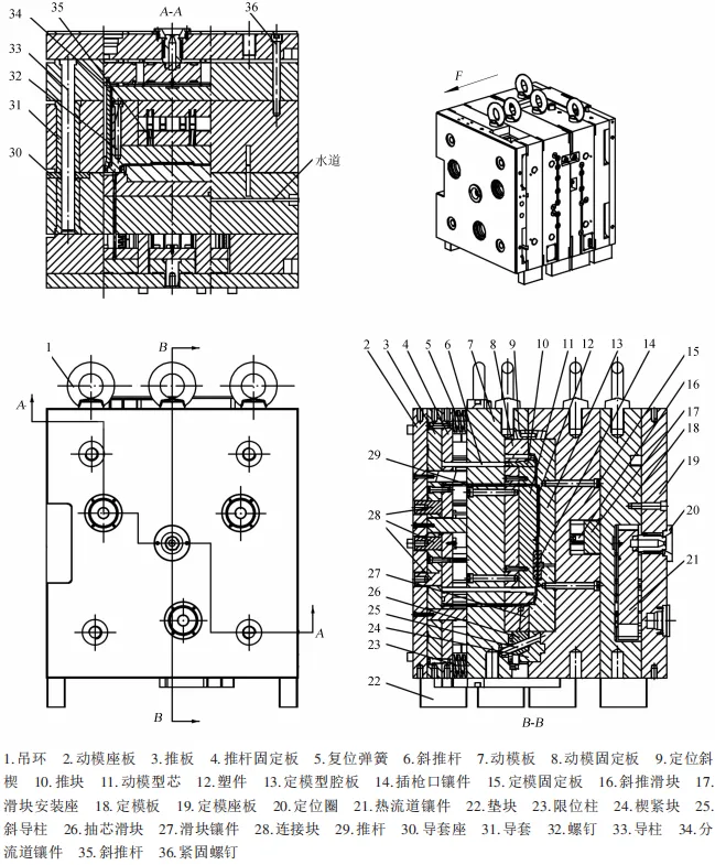 (2)开模抽芯。注射完成开模时,注塑机滑块带动动模按F方向运动,动模板7与定模板18沿分型面分离。斜推杆35在斜推滑块16驱动下完成塑件通孔的侧向抽芯。同步抽芯滑块26和滑块镶件27在斜导柱25引导下实现横向位移,完成浇口区域的外部抽芯,此时抽芯滑块26和滑块镶件27停留在动模板7处。