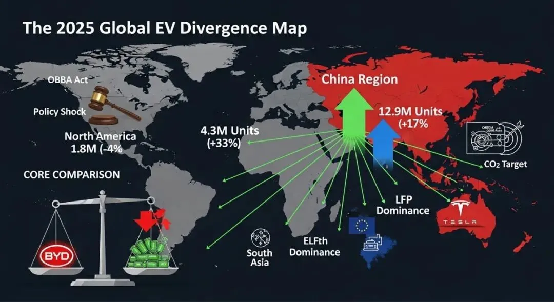 2025年标志着全球汽车产业的一个决定性转折点。尽管全球电动汽车(EV)销量创下2,070万辆的历史新高,同比增长20%,但这并非全球同步繁荣的信号,而是市场深刻分裂的开端。本文深入剖析了由政策主导的“跨大西洋脱钩”现象:中国凭借无与伦比的垂直一体化与成本优势稳居霸主地位,欧洲在严格碳排放监管下艰难复苏,而北美市场受《OBBBA法案》颁布及补贴退坡影响,陷入政策诱导的衰退。文章重点阐述了比亚迪(BYD)超越特斯拉(Tesla)登顶全球纯电销量冠军的里程碑意义,剖析了以磷酸铁锂(LFP)为核心的技术降本路径,并预判了未来全球去碳化节奏与贸易壁垒并存的碎片化格局。