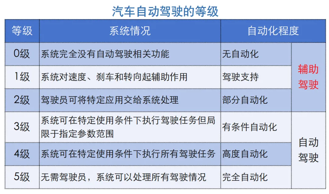 根据我国2021年8月20日发布、2022年3月1日起实施的《汽车驾驶自动化分级》国家标准(GB/T 40429-2021),汽车自动驾驶被分为0到5级(简称L0到L5),其中L0到L2级属于辅助驾驶,L3有条件自动驾驶,L4到L5级属于自动驾驶。