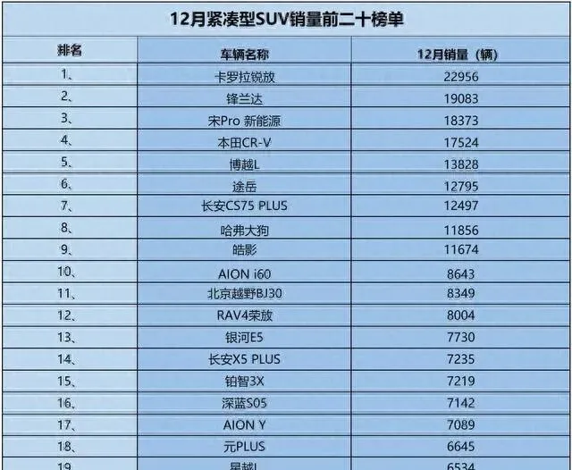 紧凑型SUV彻底卖爆了!2025年12月直接冲出9款月销破万的车型,亚军居然是锋兰达,卡罗拉锐放稳摘桂冠,这对姊妹车硬生生把“合资燃油不行了”的论调按下去又压实了一遍。