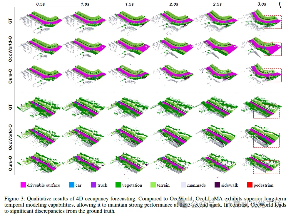 在本文中,我们提出了OccLLaMA,一个用于自动驾驶多任务的三维占用-语言-动作生成式世界模型。我们引入了一种新颖的场景分词器,用于离散化和重建占用场景。此外,我们构建了一个统一的多模态词汇表,涵盖了占用、语言和动作模态。基于该词汇表,我们使大型语言模型(LLM)适应于执行下一个标记/场景预测,以完成多任务。通过在4D占用预测、运动规划和视觉问答(VQA)上的广泛实验,我们证明了OccLLaMA的多任务有效性。在未来,我们将增加数据多样性,以进一步增强OccLLaMA的能力。我们还将探索模型量化和蒸馏,以解决由大量参数引起的推理延迟问题。