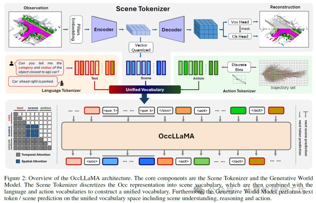 我们提出了OccLLaMA,一个统一的占用-语言-动作框架。如图2所示,OccLLaMA的核心组件包括场景分词器和占用-语言-动作生成式世界模型。为了处理多任务,我们为场景分词器训练、占用-语言-动作预训练和指令调优引入了一个三阶段训练方案。
