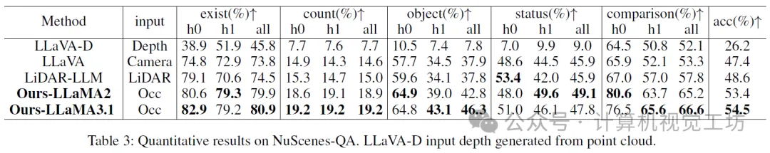 • 与最先进的方法进行了广泛的实验比较,在包括四维占用率预测、运动规划和视觉问答在内的多个任务上取得了具有竞争力的性能。