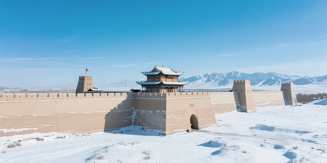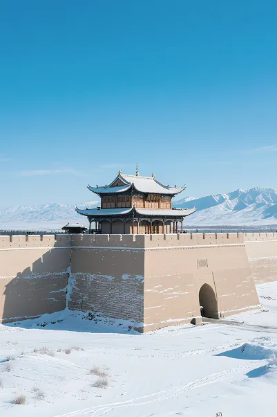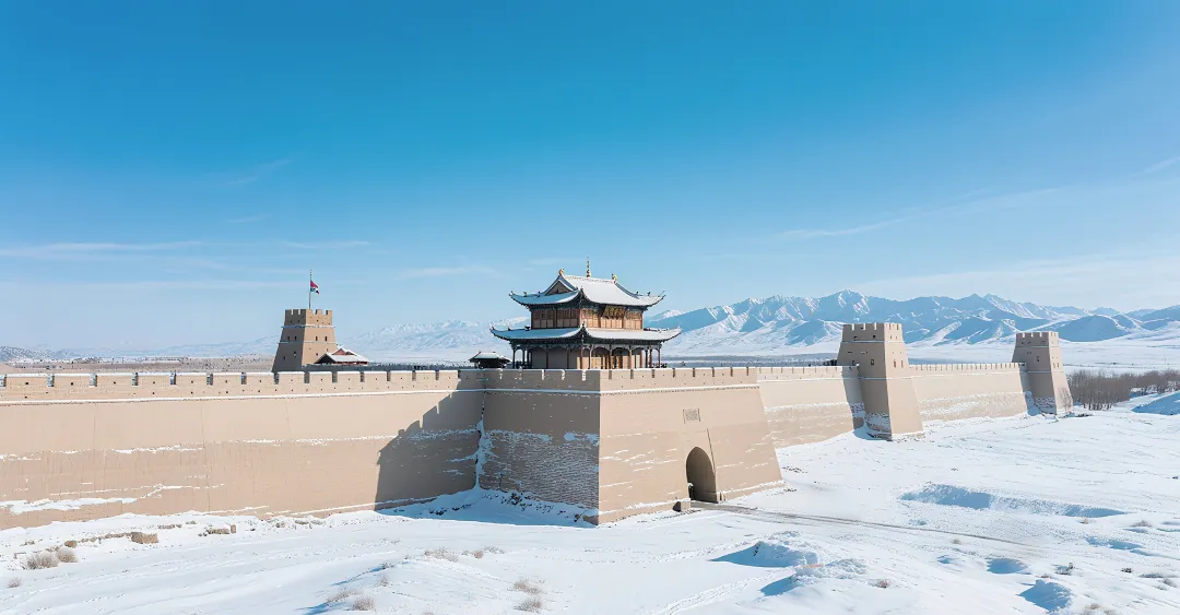 体验结束后,前往【嘉峪关】,沿途经过【瓜州戈壁艺术风情长廊】(约105KM 1H),冬日的戈壁空旷辽阔,“大地之子”“汉武帝”“无界”等艺术作品静静矗立,与戈壁雪景融为一体,既有现代艺术的创意,又呼应着河西走廊的历史。
