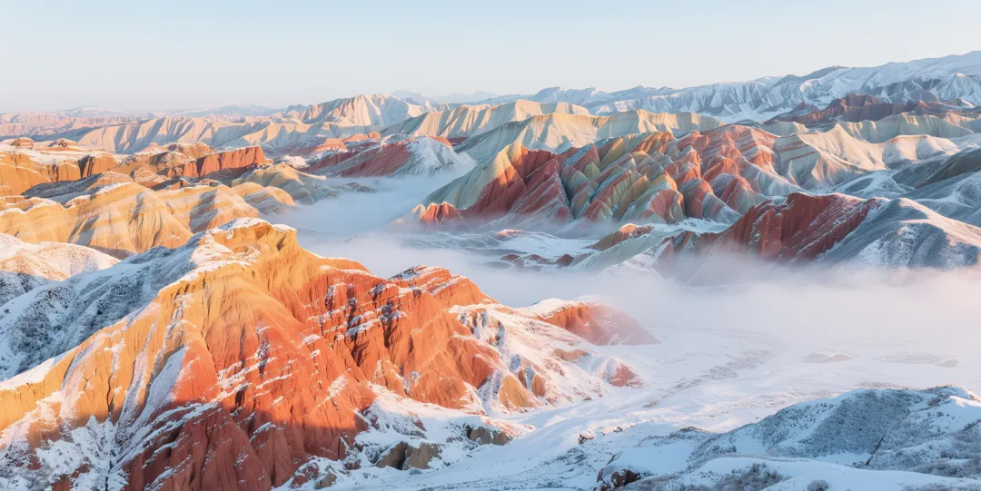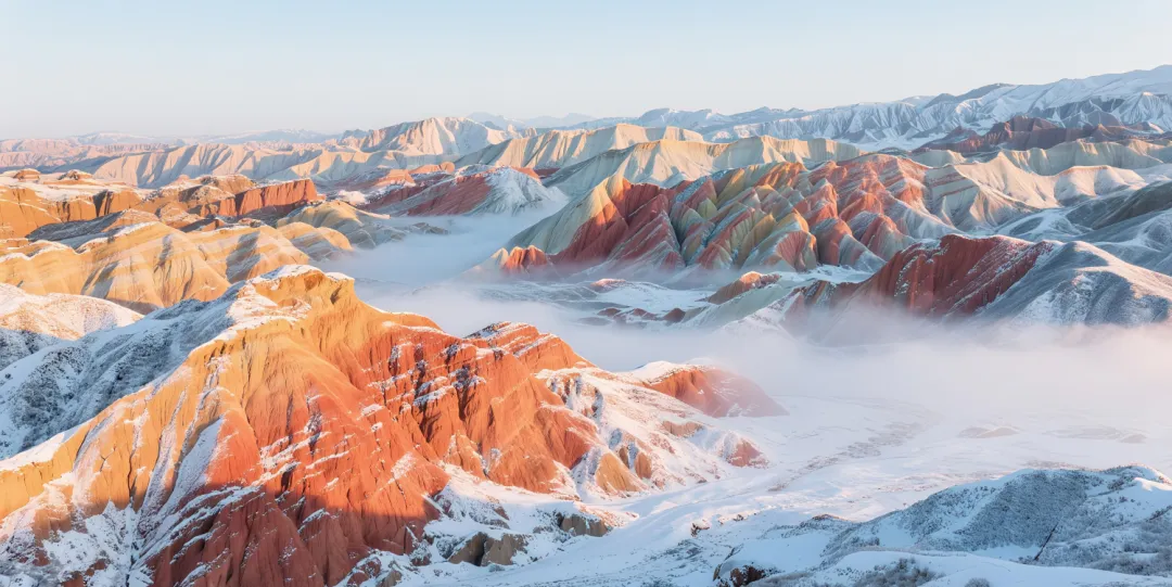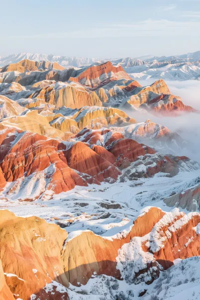 上午:早餐后出发前往【张掖七彩丹霞】(约210KM 2.5H),红色、黄色、橙色的岩层层层叠叠,造型各异,色彩斑斓又气势磅礴,让人惊叹大自然的鬼斧神工,随手一拍都是冬日限定的丹霞美景。
