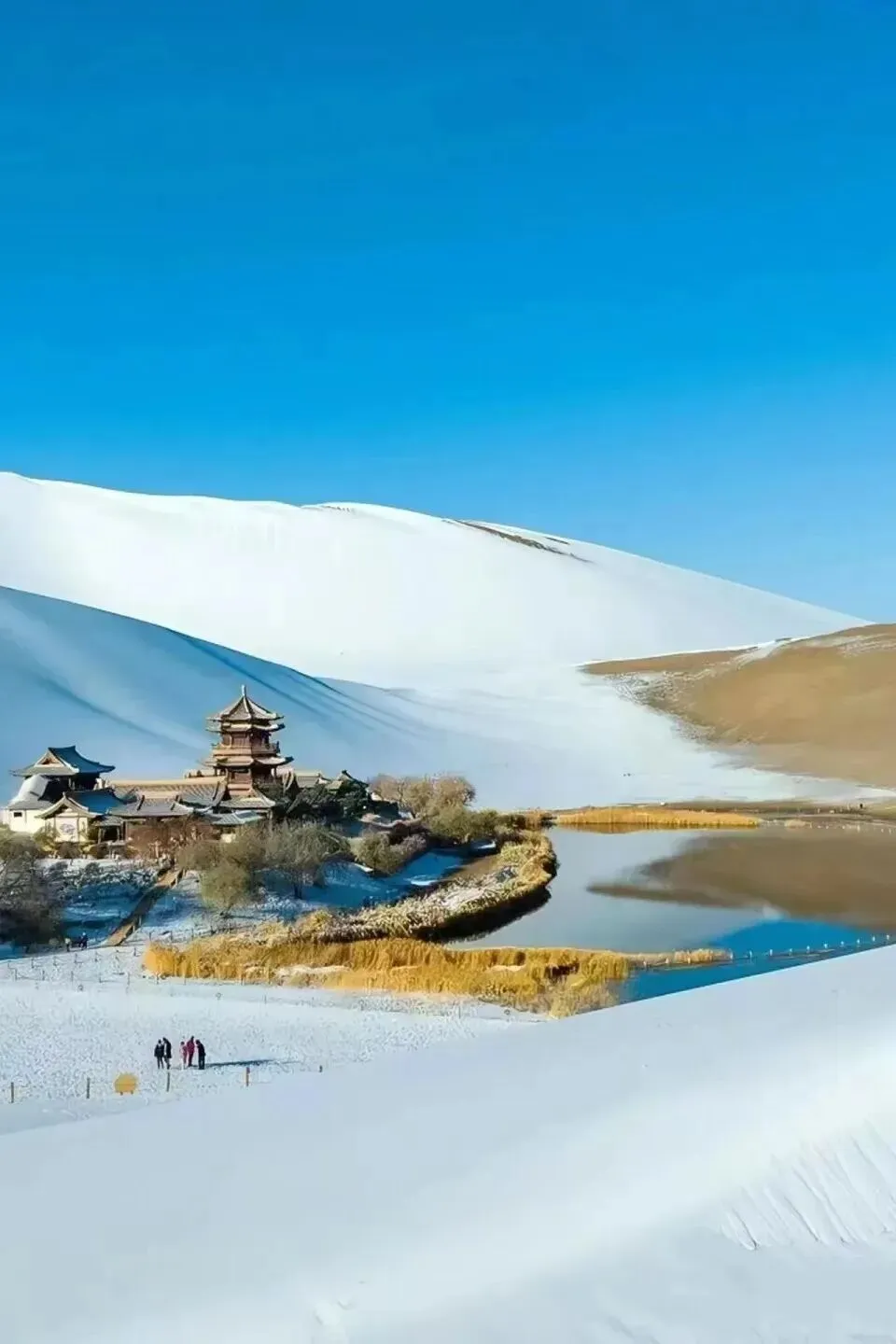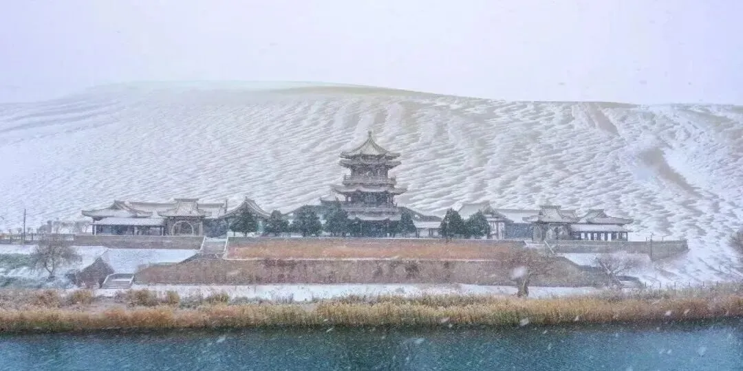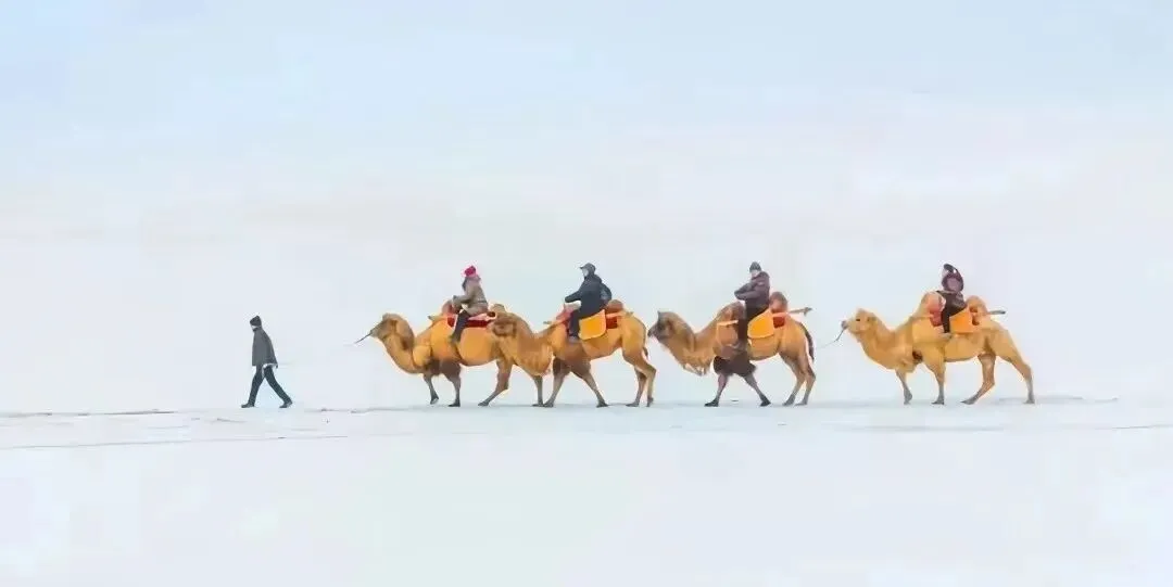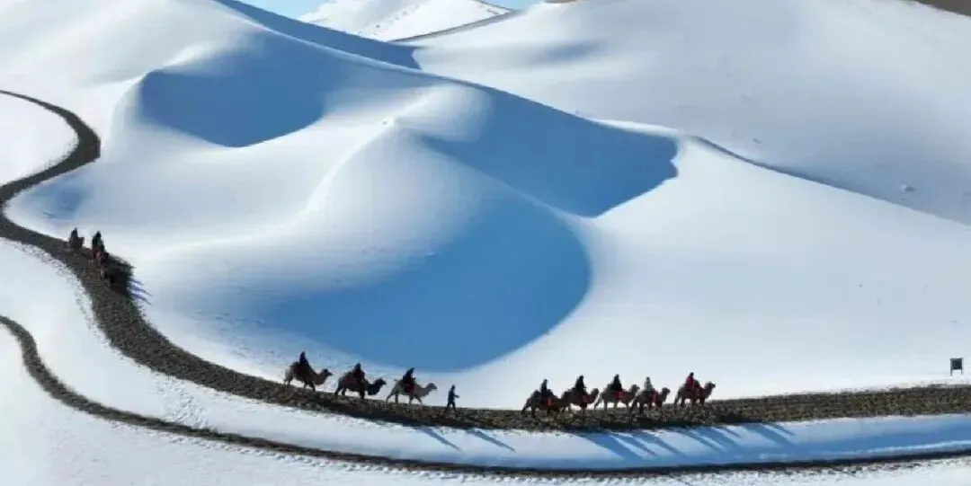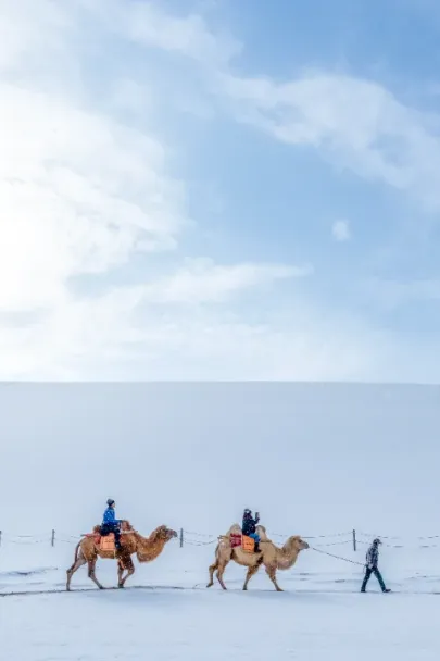 下午:抵达敦煌后享用午餐,随后前往【鸣沙山月牙泉】,体验【骑骆驼】。冬日的鸣沙山原本金黄的沙山被白雪覆盖,月牙泉像一块镶嵌在沙山间的白玉。此时远离旺季的人山人海,我们坐在骆驼上,缓缓穿行于雪沙之间,静谧又浪漫。