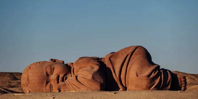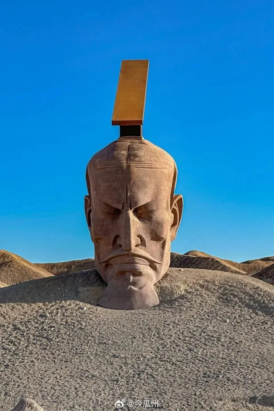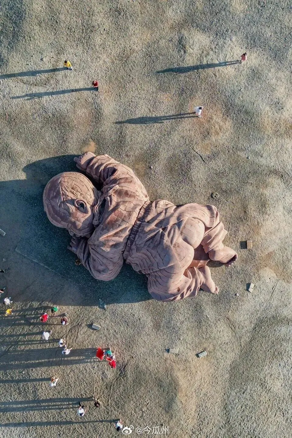 巨大的婴儿雕塑趴在戈壁上,与冬日苍茫的大地形成奇妙呼应。
