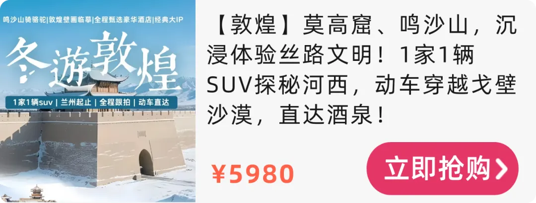 这个冬天,1家1车,全程管家服务,驾驶SUV纵穿河西走廊,乘坐动车高效转场,既可以带孩子潮酷出行, 穿越戈壁沙漠,又能省去奔波,将8小时车程直接缩短至4小时,开启一段舒适且震撼的冬日敦煌之旅。