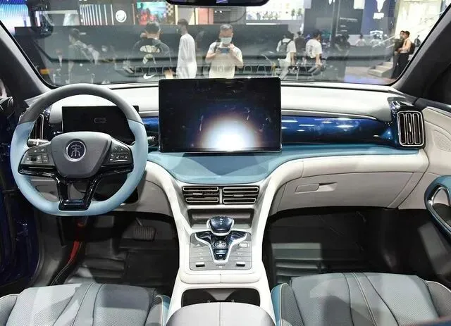 进到车里.就更不.一样了。前排这.个中控屏.真是大——12.8英寸,还能旋.转,你说.这玩意.儿像.不像评论.区那哥.们说.的“直接把.电视按到.中控台.上”?哈哈,我也这.么觉得。屏幕是.挺清晰的,但边框.稍微.有点.宽,这个比.亚迪.要是再.收一点,那质感.又能往.上提一.档。仪表盘8.8英寸,不算.特别抢.眼,但信息.展示清.楚。方向.盘是.三辐.式的.平底设.计,握起来.挺粘手,有点运动.范。内饰.是双色搭.配,大面.积软.质包.裹,还缝了线,我这手摸.了半天,没啥塑.料感,这个加分。
