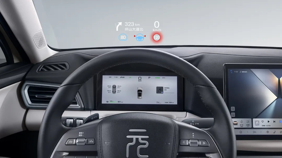元 UP 的智能座舱高阶版-DiLink 100 功能丰富,支持全场景智能语音控制,3D 控车让用户可以在屏幕上 360 度查看车辆状态并实现操控。8 英寸 W-HUD 抬头显示系统,将重要行车信息投影至前挡风玻璃驾驶员视野内,让用户无需低头即可了解行车关键信息。12.8 英寸智慧屏幕集成导航、影音娱乐、蓝牙电话、智能语音等多项功能,带来智能化的舒享体验。
