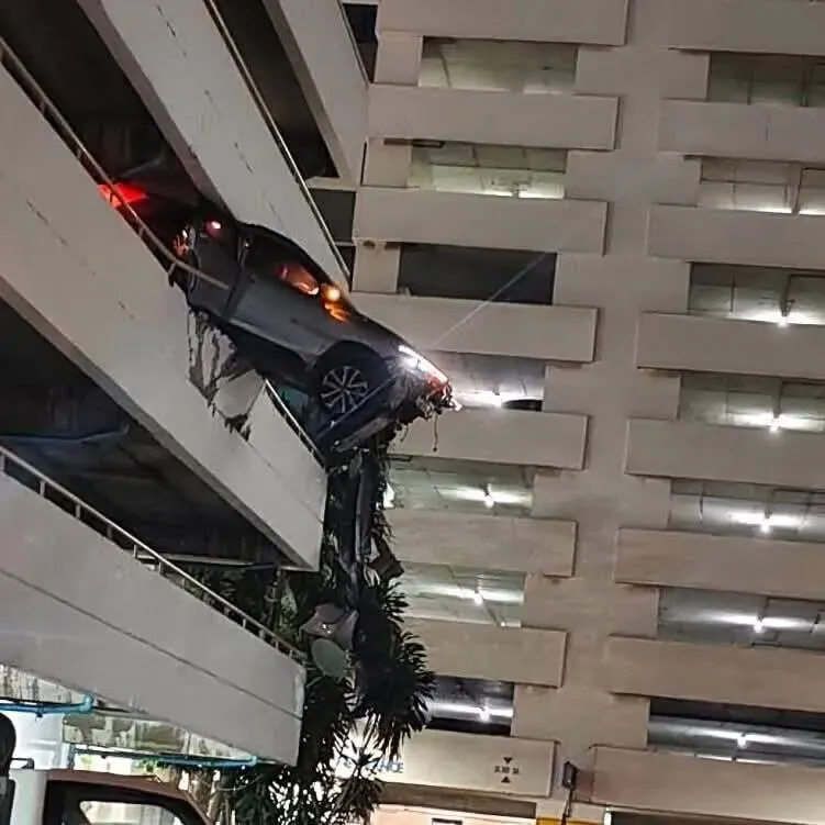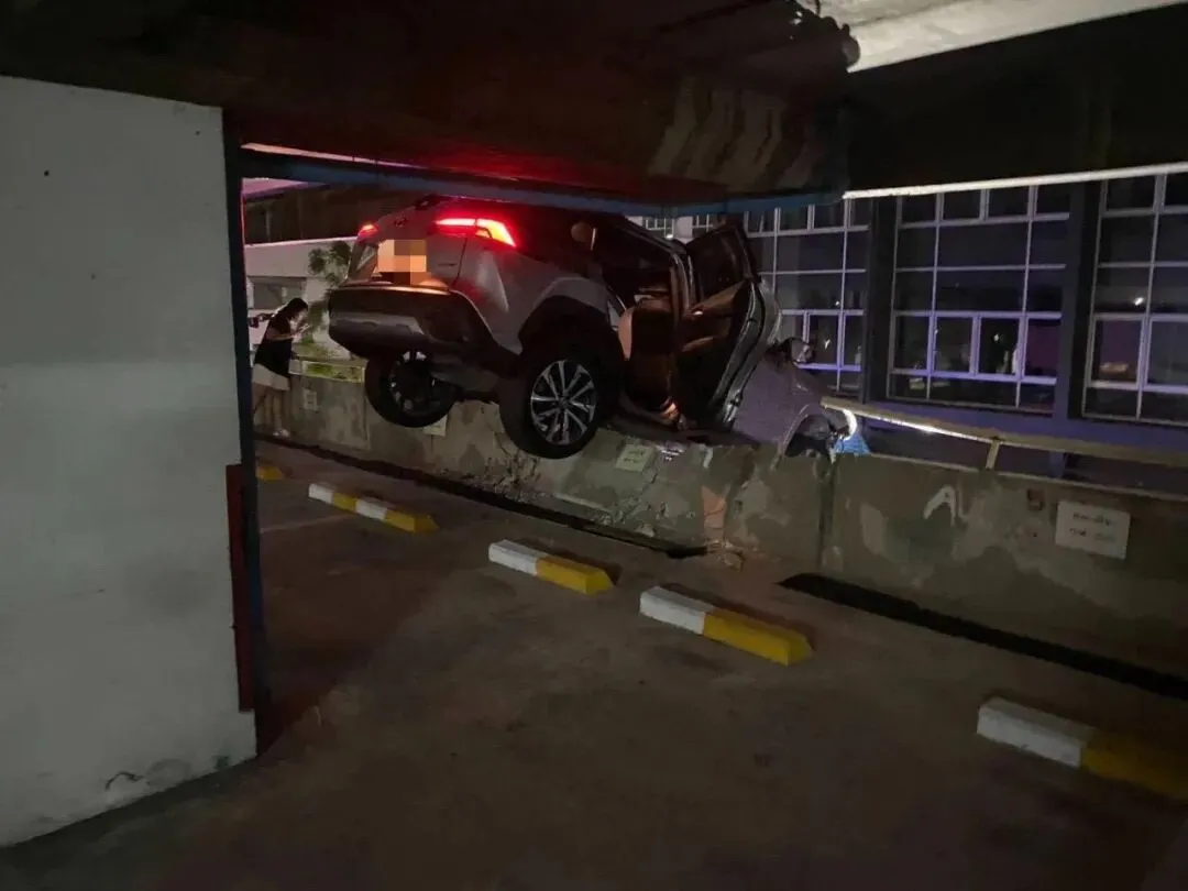 据现场消息,事故发生在孔提区拉玛四路附近的一处多层停车楼内。该停车楼共7层,事故发生在二层位置,一辆灰色丰田轿车在行驶过程中撞穿混凝土护栏,整车停在建筑边缘,仅靠后部结构支撑,车身悬空,存在坠落风险。