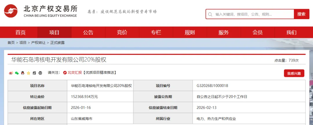 日前,北京产权交易所披露了《华能石岛湾核电开发有限公司20%股权》产权转让信息。目前,华能石岛湾核电开发有限公司股权结构为:华能核电开发有限公司持股30%,国家核电技术有限公司持股25%,华能国际电力股份有限公司持股22.5%,华能国际电力开发公司持股22.5%。