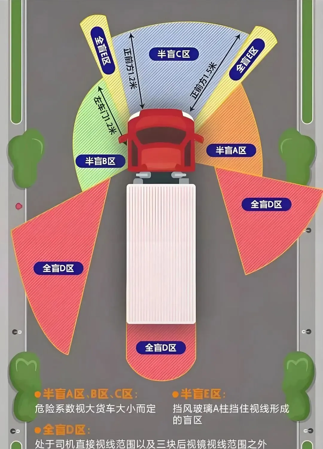要特别注意防范大型车辆视觉盲区,大型货车、客车等车辆的前后左右存在较大范围盲区。骑行时应主动远离,避免与之长时间并行或停留于其侧后方。切勿与正在转弯的大型车辆同时进入路口,更不要从其车头前方抢行绕行。