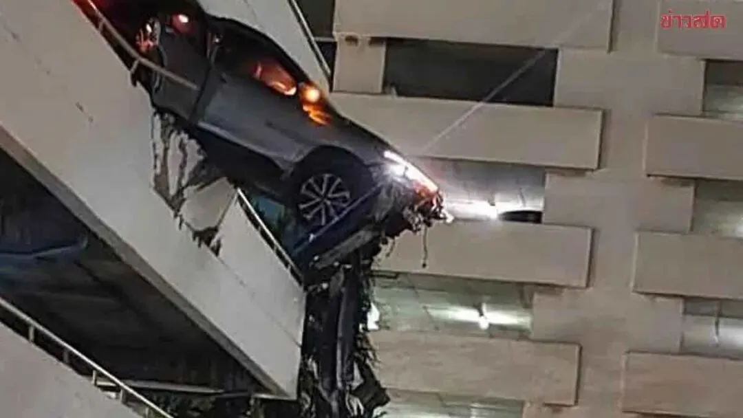 曼谷拉玛四路一栋七层高的停车楼发生惊险事故,一辆丰田轿车撞破护栏悬于二层边缘,所幸司机成功脱险,无人员伤亡。