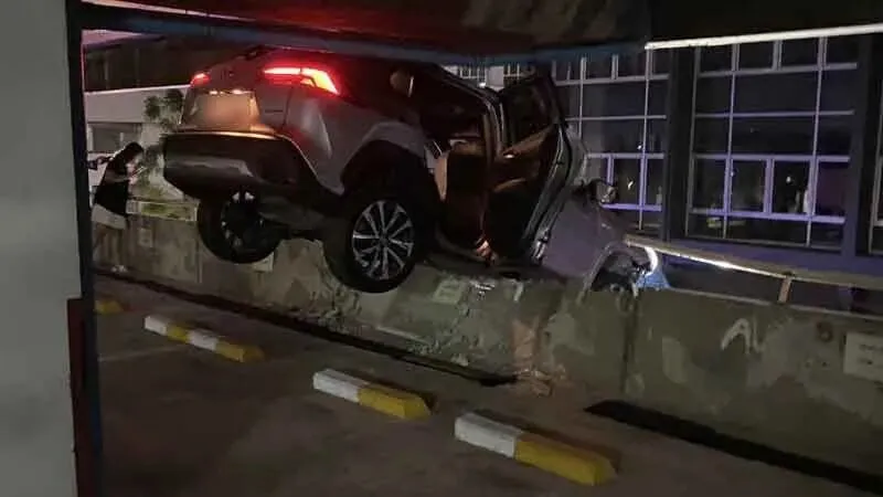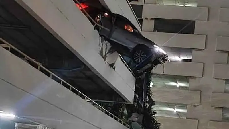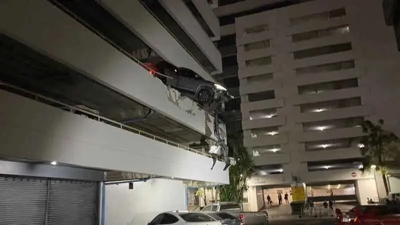 事发地点为一栋七层楼高的停车楼,工作人员于二层区域发现一辆曼谷牌照的灰色丰田轿车,该车撞破水泥护栏后悬于停车楼边缘,令目击者心惊不已。