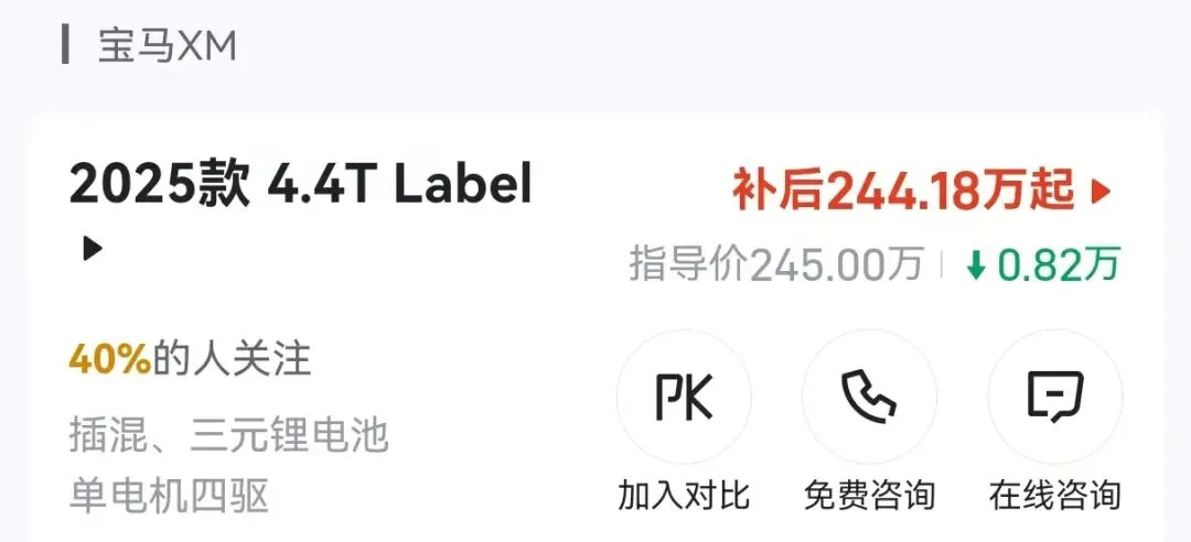 说实话,宝马XM 2025款4.4T Label这款车动力、空间、颜值这块确实没啥问题,4.4T定位确实太独特了,对于有钱人来说,这种车就是最好的伴侣。那么问题来说,如果你真的有245万的购车预算,你会选择宝马XM 2025款4.4T Label吗?