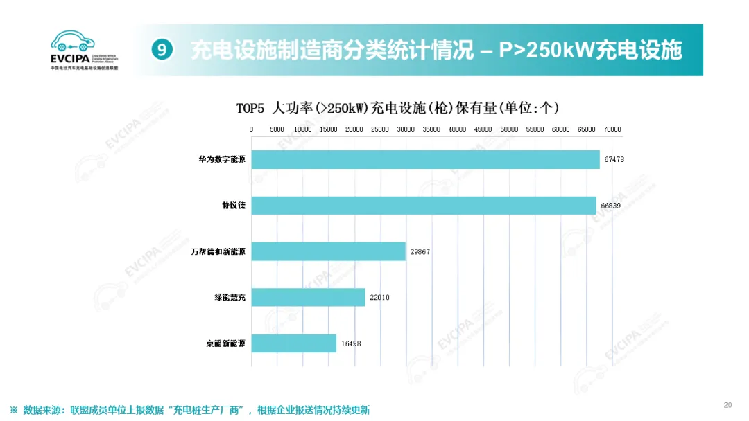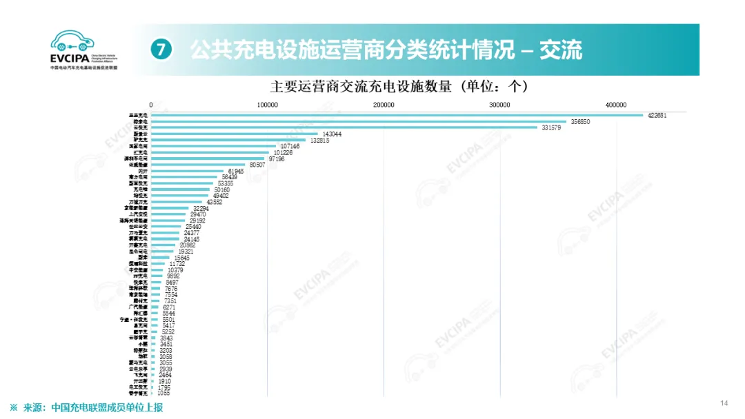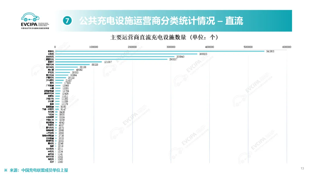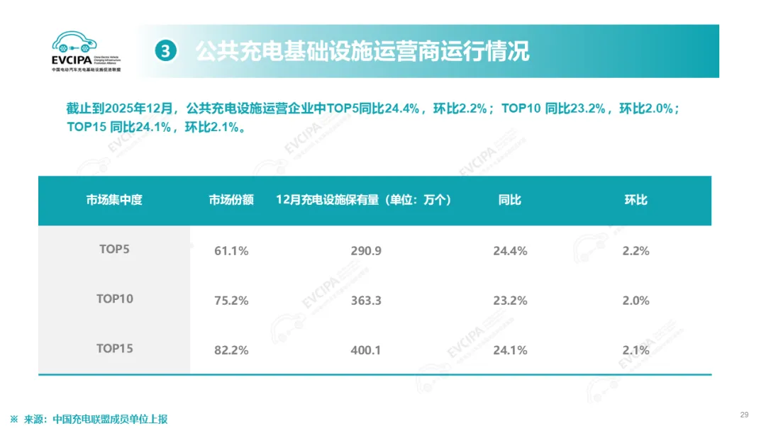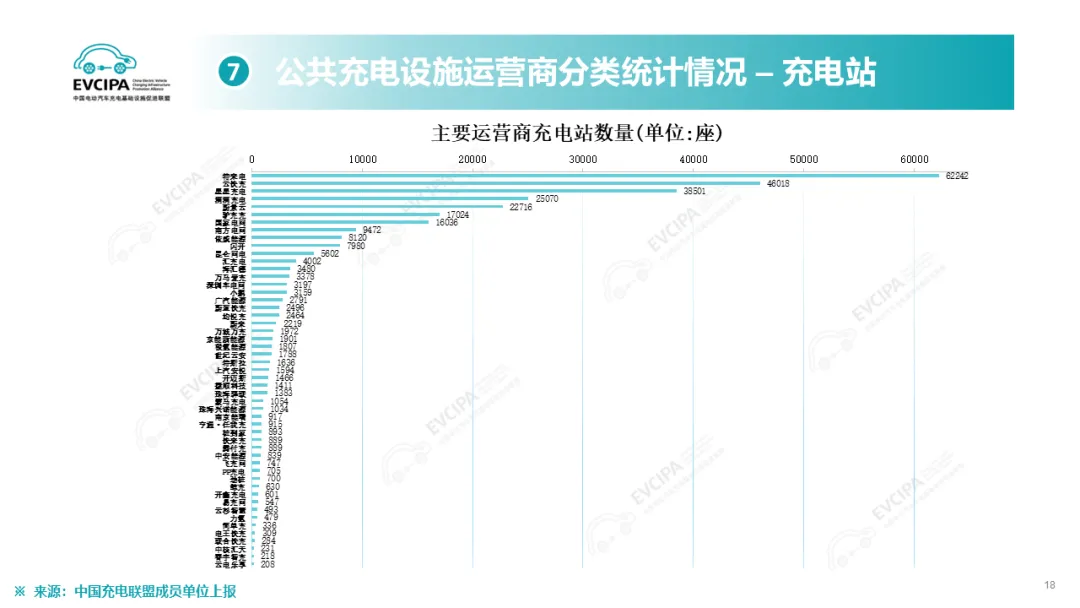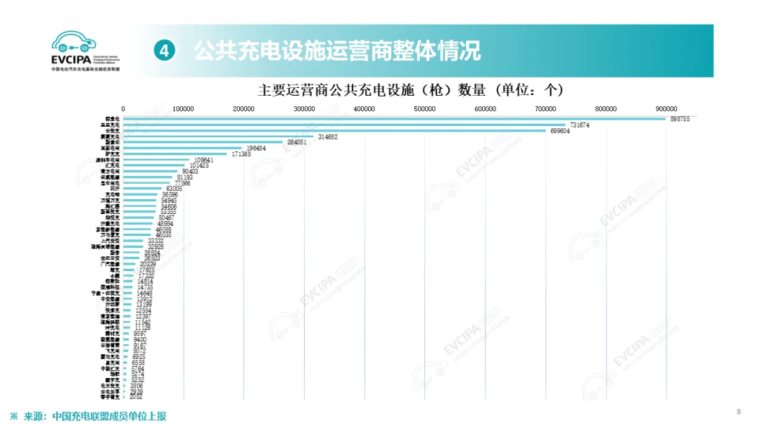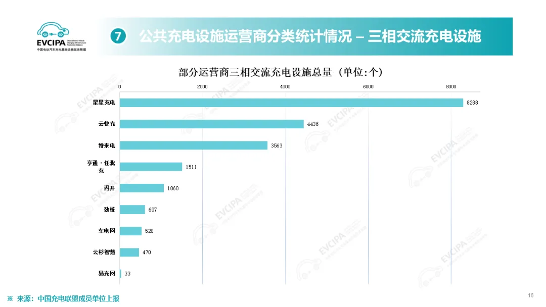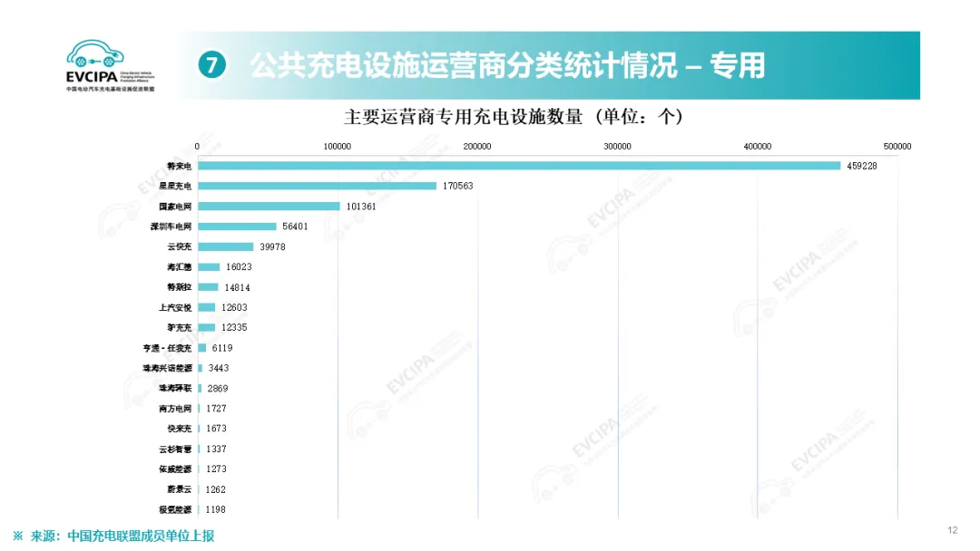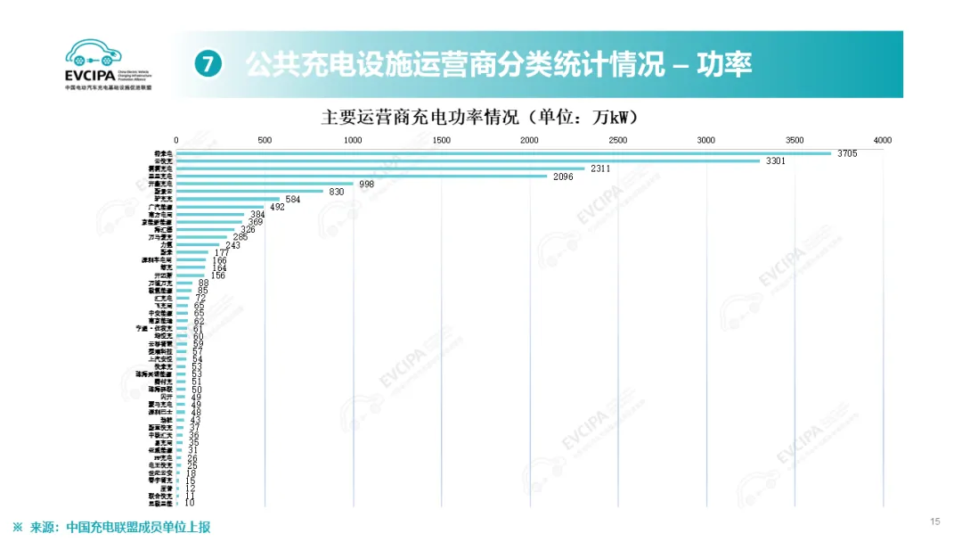 公共充电基础设施运营商运行情况,截止到2025年12月,全国充电运营企业所运营充电桩数量TOP15,分别为:特来电运营89.9万个、星星充电运营73.2万个、云快充运营70.0万个、滴滴充电运营31.5万个、蔚景云运营26.4万个、国家电网运营19.6万个、驴充充运营17.1万个、深圳车电网运营11.0万个、汇充电运营10.1万个、南方电网运营9.0万个、依威能源运营8.1万个、昆仑网电运营7.8万个、闪开运营6.3万个、充电喵运营5.7万个、万城万充运营5.5万个。这15家运营商占总量的82.2%,其余的运营商占总量的17.8%。