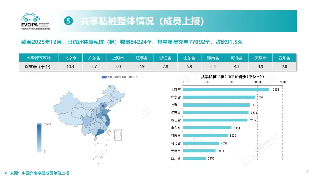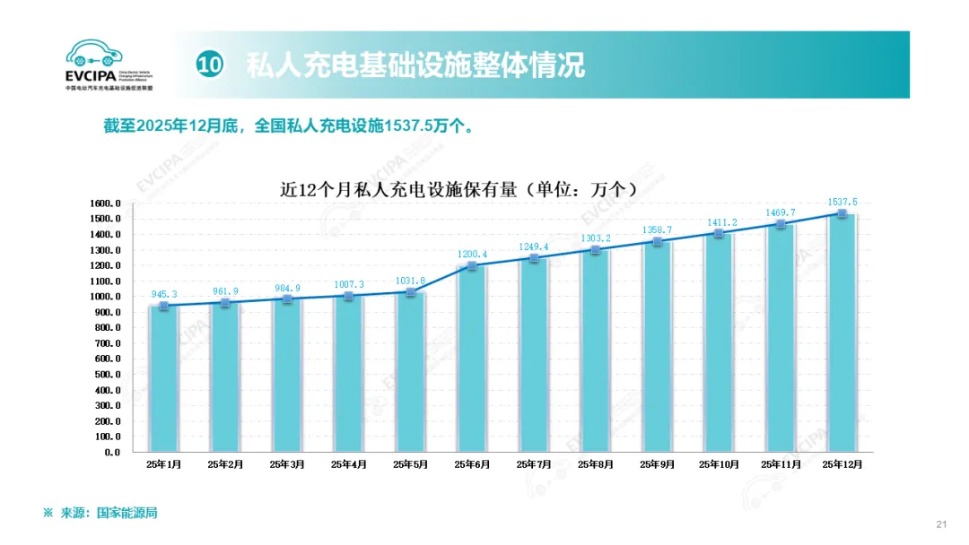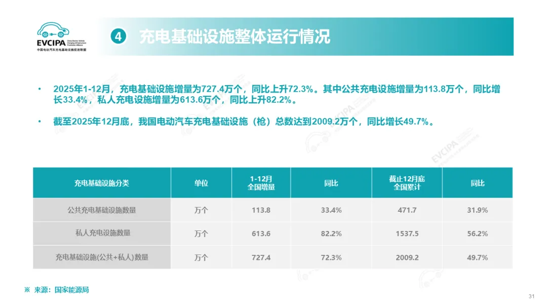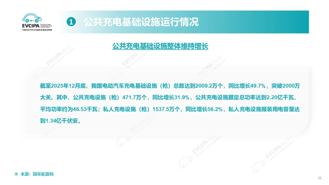 公共充电基础设施运行情况,截至2025年12月底,我国电动汽车充电基础设施(枪)总数达到2009.2万个,同比增长49.7%,突破2000万大关。其中,公共充电设施(枪)471.7万个,同比增长31.9%,公共充电桩额定总功率达到2.20亿千瓦,平均功率约为46.53千瓦;私人充电设施(枪)1537.5万个,同比增长56.2%,私人充电设施报装用电容量达到1.34亿千伏安。