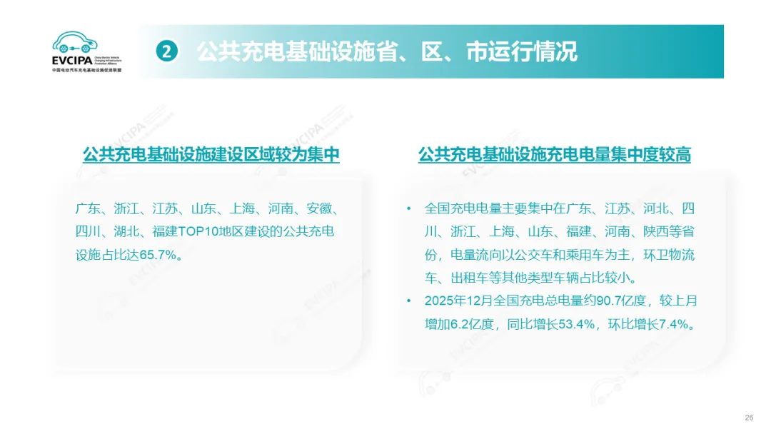 公共充电基础设施省、区、市运行情况,广东、浙江、江苏、山东、上海、河南、安徽、四川、湖北、福建TOP10地区建设的公共充电设施占比达65.7%。全国充电电量主要集中在广东、江苏、河北、四川、浙江、上海、山东、福建、河南、陕西等省份,电量流向以公交车和乘用车为主,环卫物流车、出租车等其他类型车辆占比较小。2025年12月全国充电总电量约90.7亿度,较上月增加6.2亿度,同比增长53.4%,环比增长7.4%。
