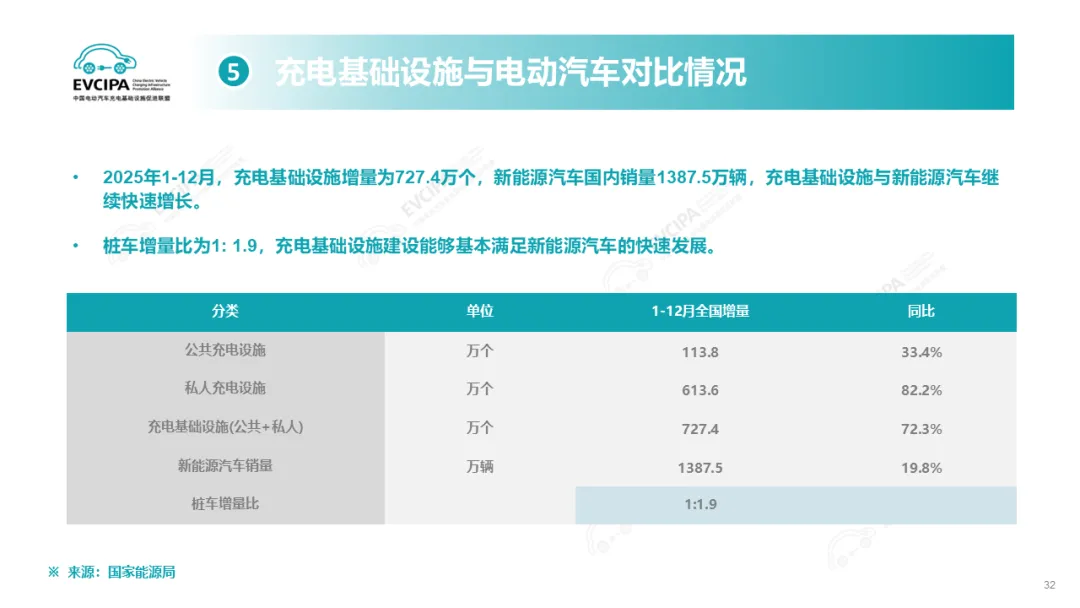 充电基础设施与电动汽车对比情况,2025年1-12月,充电基础设施增量为727.4万个,新能源汽车国内销量1387.5万辆,充电基础设施与新能源汽车继续快速增长。桩车增量比为1: 1.9,充电基础设施建设能够基本满足新能源汽车的快速发展。