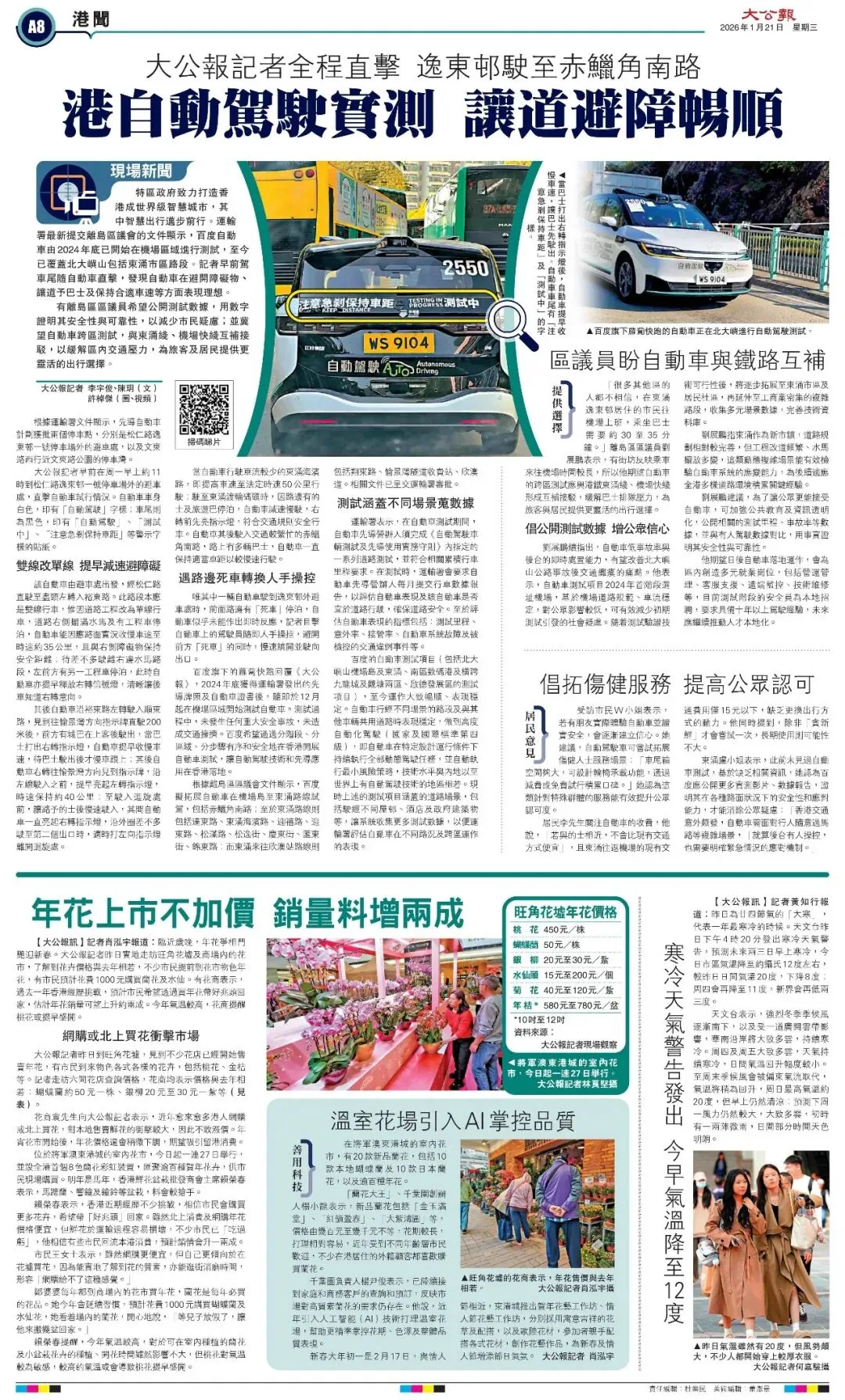 百度旗下的萝卜快跑回复《大公报》,2024年底获得运输署发出的先导牌照及自动车证书后,随即于12月起在机场区域开始测试自动车。测试过程中,未发生任何重大安全事故,未造成交通拥挤。百度希望通过分阶段、分区域、分步骤有序和安全地在香港开展自动车测试,让自动驾驶技术和先导应用在香港落地。