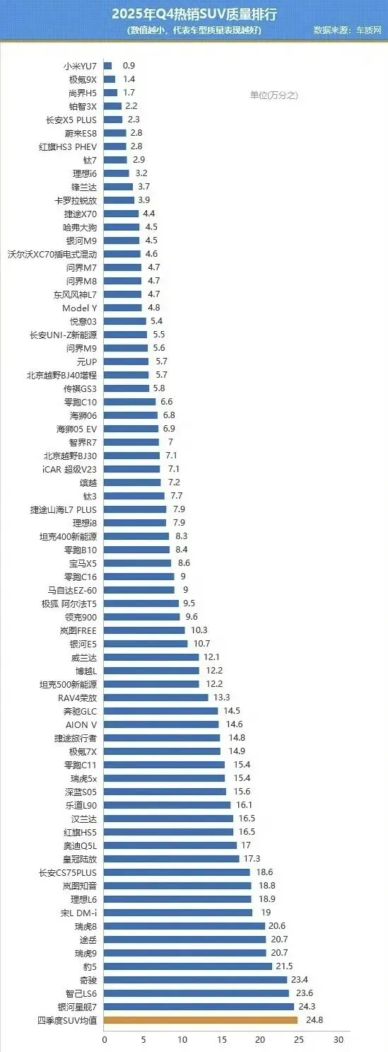 据车质网最新发布的2025年四季度国内热销SUV质量排行显示,小米YU7在投诉销量比这一关键质量指标上表现突出,数值为万分之0.9,低于行业平均水平(万分之24.8),在参与评比的358款车型中位列第一(投诉销量比越低,代表车辆的质量稳定性越好)。