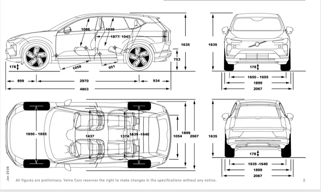 低矮的前脸、倾斜的车顶线条和收窄的车身侧面都提升了整体的空气动力学效率。因此,EX60能够更好地划过空气,拥有极具竞争力的0.26风阻系数,这有助于实现同级领先的续航。内饰方面,EX60在多功能性和实用性方面表现出色。长轴距和平坦的地板为后排创造了更多的腿部空间,以及宽敞的行李厢和各种用于存放个人物品的智能储物空间。
