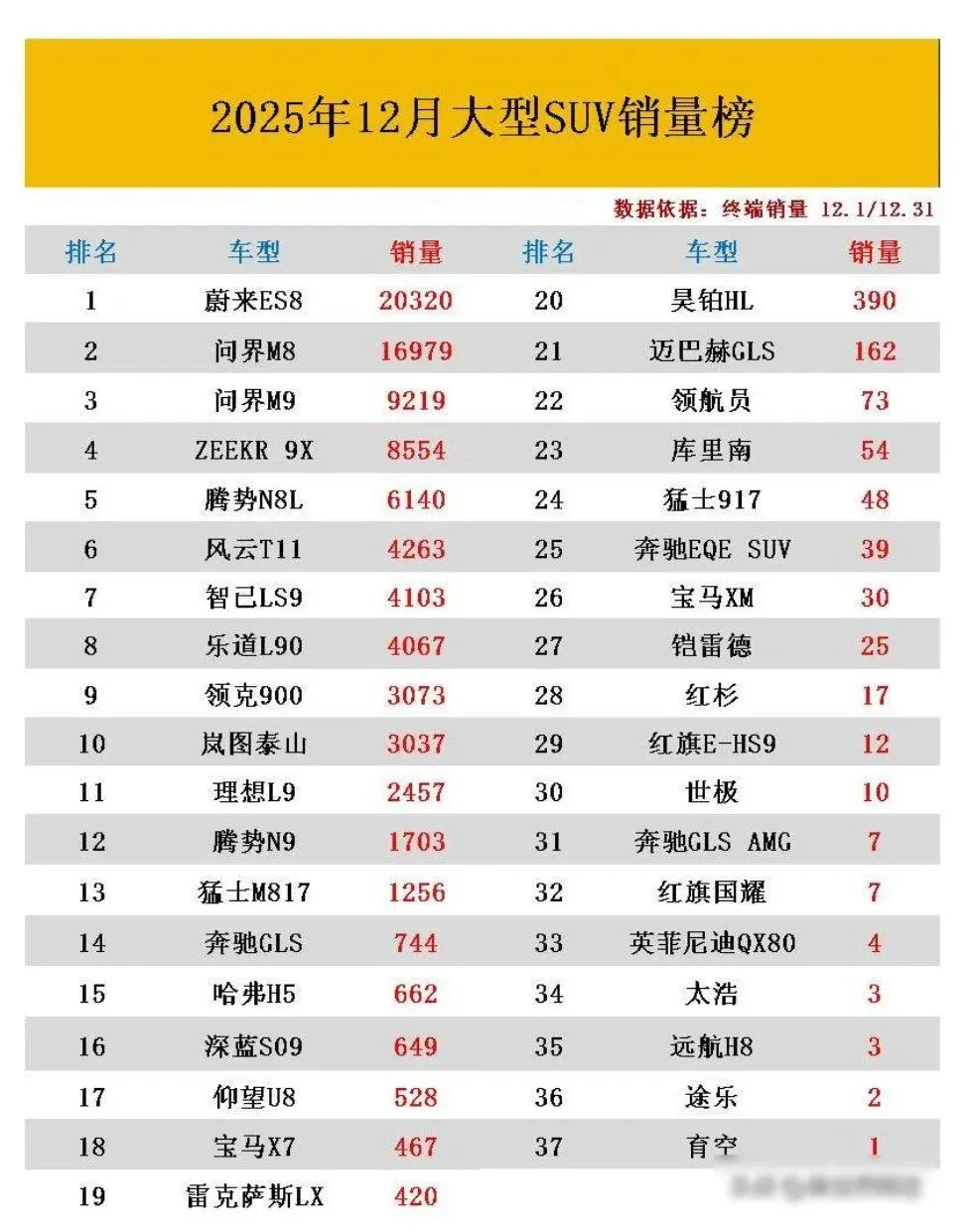 其实这事儿想想也不奇怪,蔚来ES8上个月卖了两万多辆,把问界M8、M9全甩在后头,腾势N8L这名字以前没听过,一上来就挤进前五,风云T11、智己LS9这些车我连名字都没见过,这回全进了前十,宝马X7才卖四百多辆,连奔驰GLS的一半都赶不上,更别说比隔壁仰望U8了。
