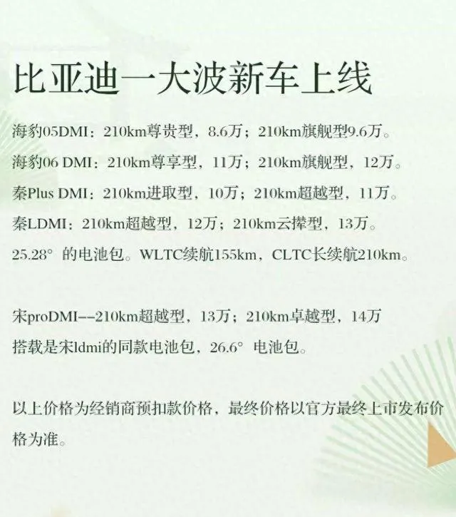 再说比亚迪的技术底子,这次能把插混长续航车型价格压得这么低,其实是因为DM-i 5.0平台持续降本,配合电池供应链的优势,既保持了动力和续航的双重提升,价格反而没怎么涨。比如秦L还加了云辇-C底盘系统,13万就能买到过去二十多万才有的智能悬挂,驾乘舒适性直接拉满。海豹06定位年轻家庭路线,设计感到位,11万多的售价对比合资车真挺香。从秦PLUS、秦L到海豹06,10万-13万区间直接覆盖了不同人群,配置没缩水,反而有不少升级,像连续语音、上下电一体、全场景智能互联这些功能都下放到荣耀版,体验感也挺强。现在买车,预算10万出头,不再是只能看动力够不够、空间大不大,而是能不能享受到智能科技和长续航的双重红利。