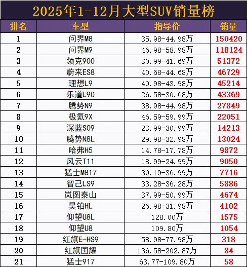 新能源车的迅速崛起,带火了曾经冷清的高端大型SUV市场,随着越来越多国产品牌的下场,大型SUV市场不仅车型大幅增加,销量也迎来了大爆发。据最新统计的2025年1-12月大型SUV销量榜显示,过去的2025年大型SUV车型已增加到了21款,拥有电动化和智能化优势的新能源车型占据了19款,其中华为先进科技背书的问界成为最大赢家,包揽了榜单冠亚军,性价比出色的领克900跻身前3,蔚来ES8后程发力,连续反超理想L9和乐道L90,成功闯入榜单前5名,极氪9X、腾势N8L等重磅车型纷纷跻身榜单前10名。此外,备受关注的猛士M817、岚图泰山也展现出了不错的市场潜力,后续销量表现更值得期待。官宣!1-12月大型SUV销量榜,问界M9亚军,理想L9第5,仰望U8L第17详细情况,榜单中已有两款车型销量突破10万辆大关,这对于高售价的大型SUV市场来说是非常罕见的。其中2025年4月才上市的问界M8强势夺冠,仅有8个多月就售出了15万辆新车,实力斐然,问界M9排名第2,销量也接近月均万辆,领克900以51372辆的销量夺得季军,此外,蔚来ES8、理想L9、乐道L90都超4万辆,市场表现不俗。腾势N9、极氪9X都2万多辆,深蓝S09、腾势N8L跻身前10,销量都超万辆。榜单仅有的两款燃油车中哈弗H5排名第11,全年销量9872辆,也是榜单中唯一售价低于20万的大型SUV,另一款则是排名第20的红旗国耀,仅售出84辆,猛士M817市场潜力不错,销量排在了智己LS9、昊铂HL等新势力车型之上,仰望U8L和仰望U8两者合计交付2600多辆,作为百万级的旗舰车型,这样的表现也实属不易,最后,猛士917排名垫底,全年销量仅58辆,甚至不及价格更高的红旗国耀,表现惨淡。