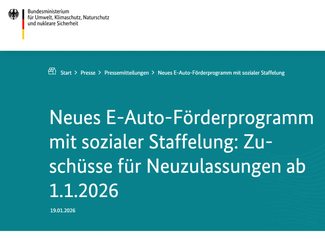 2026年1月19日,德国政府重启电动汽车购置补贴政策。