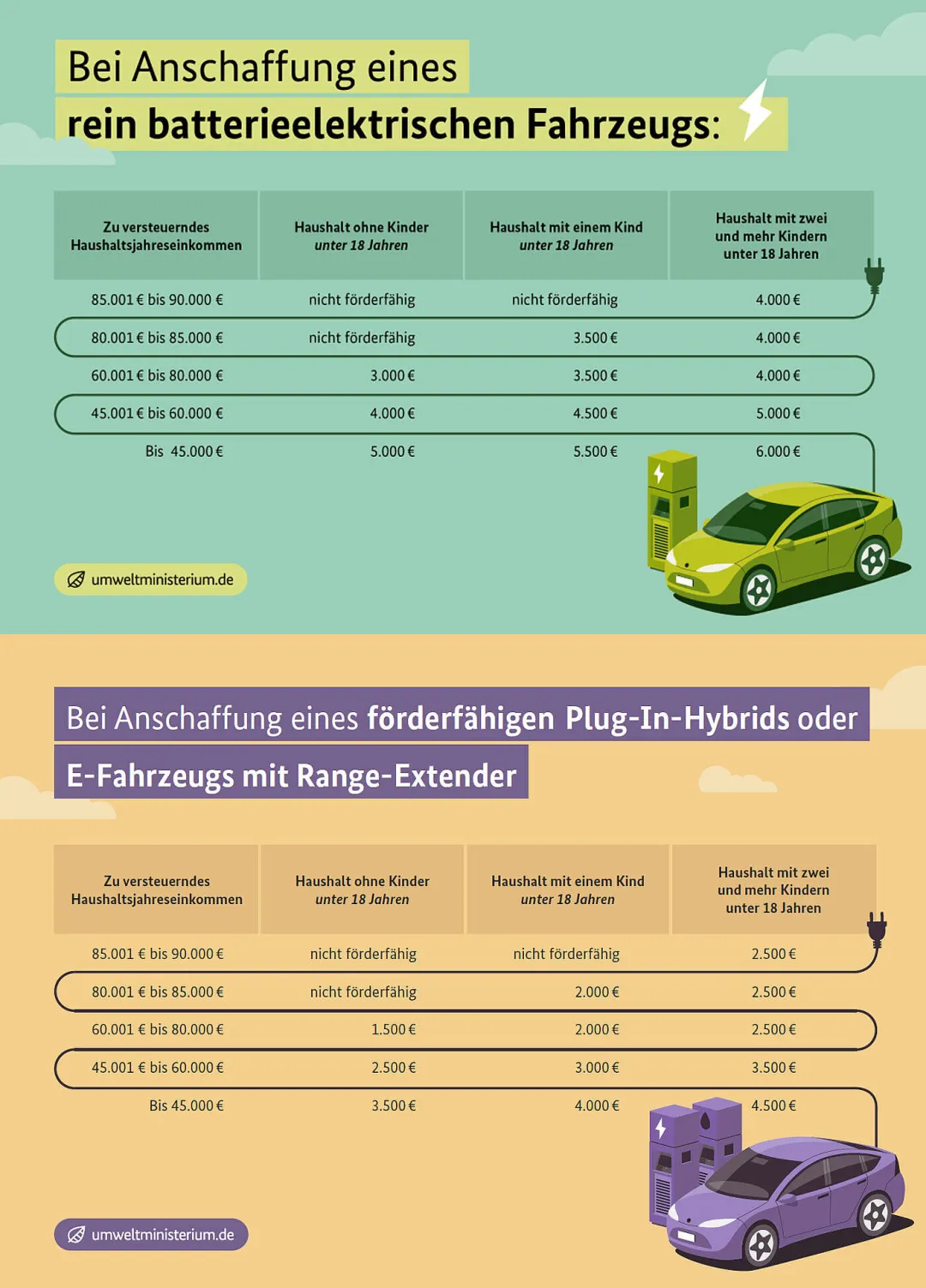 自 2026 年 1 月 1 日起,新注册的纯电动汽车(BEV)、符合条件的插电式混合动力汽车(PHEV)以及带增程器的电动车,只要私人用户的家庭应税年收入未超过政策设定的上限,即可申请金额在 1,500 至 6,000 欧元之间的购车或租赁补贴。