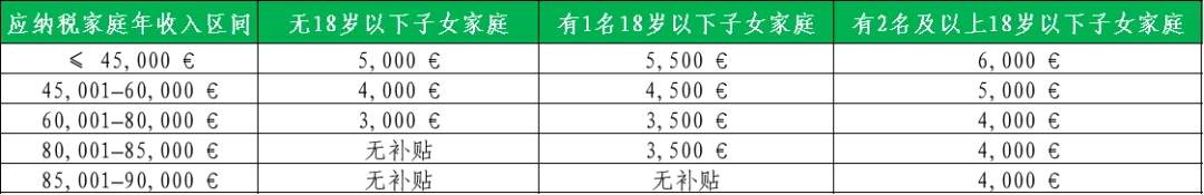 对于年应税收入不超过6万欧元的家庭,基础补贴将额外增加1,000欧元;年应税收入不超过4.5万欧元的家庭可再获得1,000欧元追加补贴。